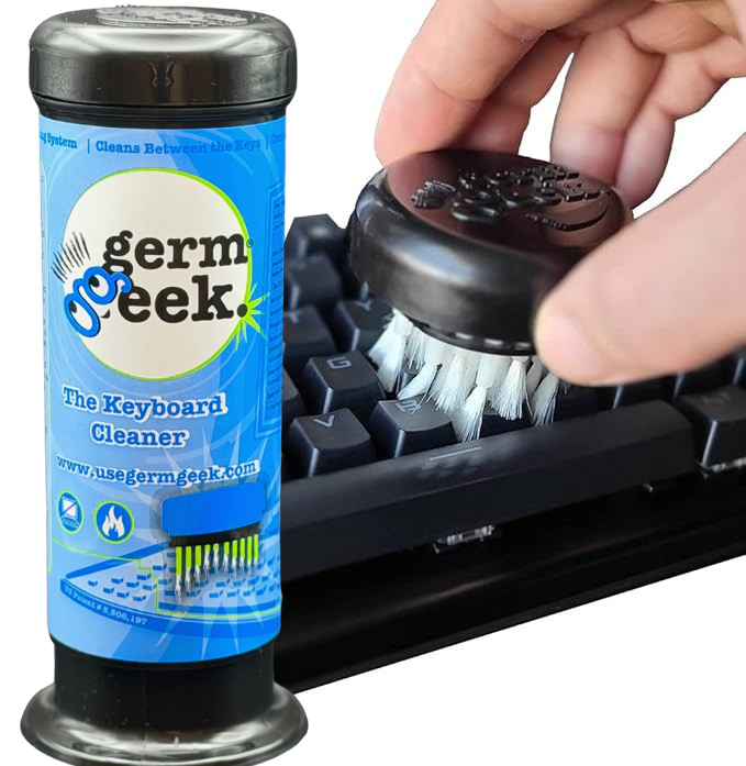 Tired of crumbs, dust, and grime slowing you down? Germ Geek is the patented keyboard and tech cleaning tool built for students, gamers, and professionals who demand a clear desk and a clear mind. With precision bristles and a reusable design, it reaches where wipes, sprays, and canned air can’t for a fast, safe, and satisfying clean. Keep your tech spotless, boost productivity, and enjoy the Clear Desk Advantage.